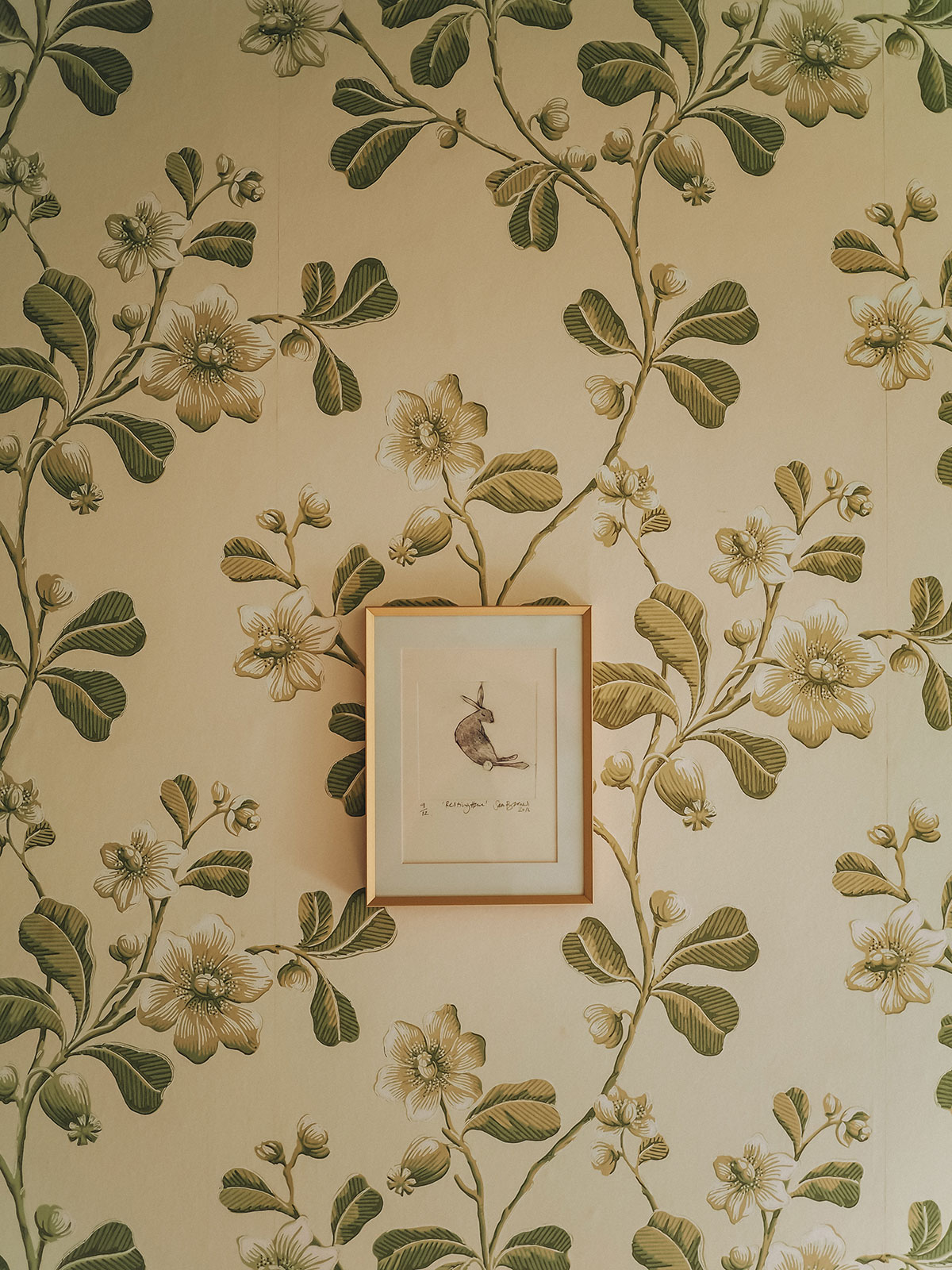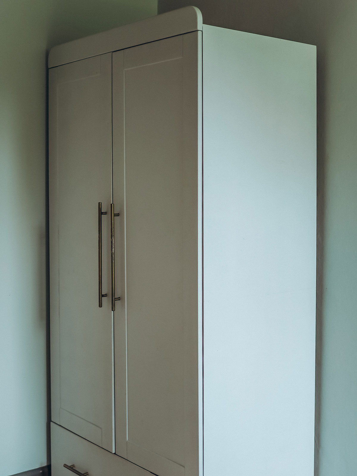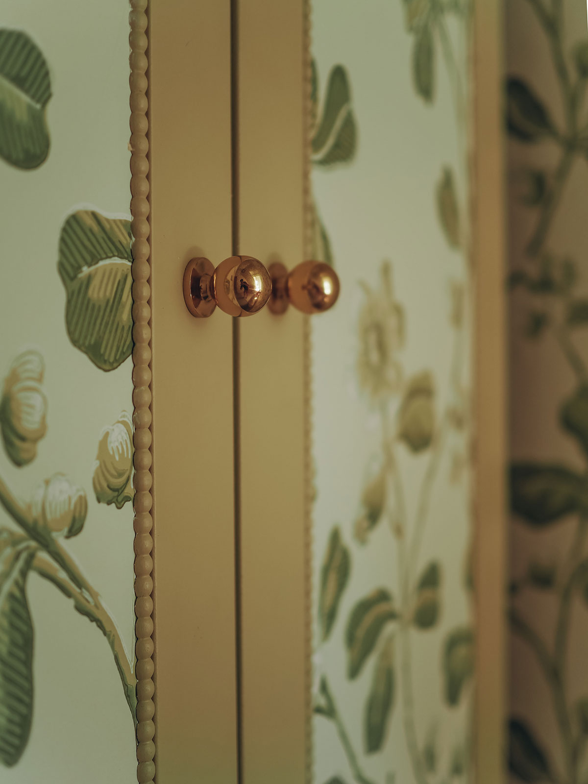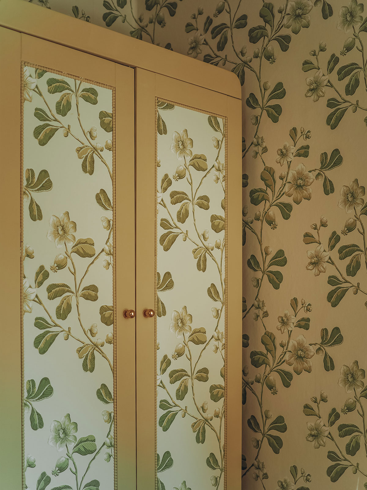 The wardrobe was inherited eight years ago from friends and has been through a couple of transformations in her time but this one is my favourite. I painted in the same Apple shade, papered with offcuts, added a tiny, sweet bobbin trim (nod to the bedside table) and finished with the matching brass knobs (the full process captured on film here).