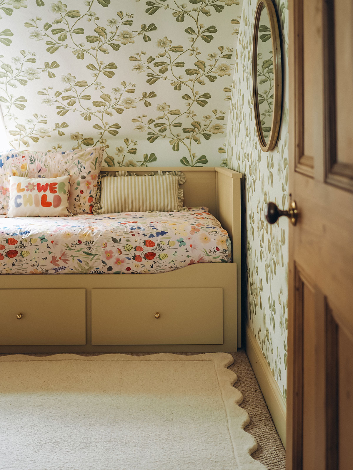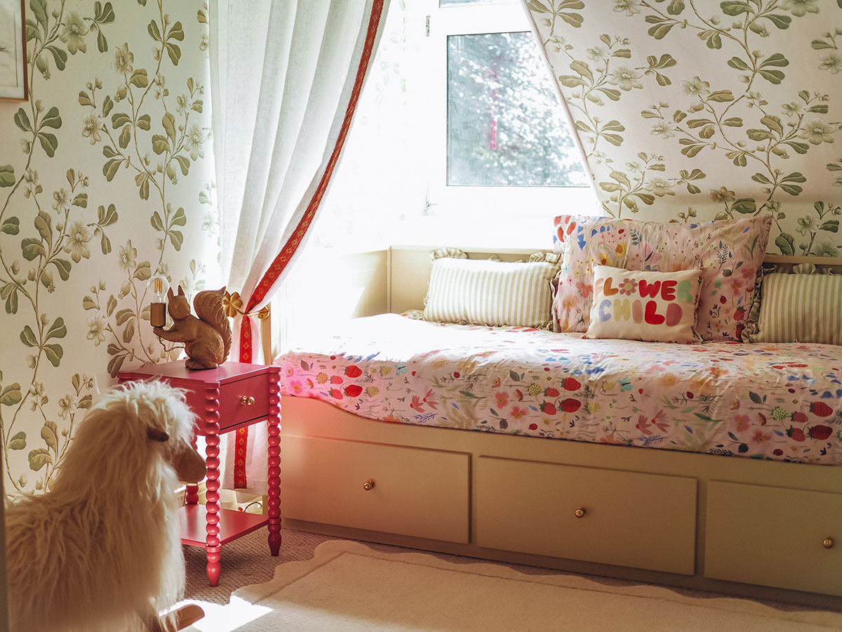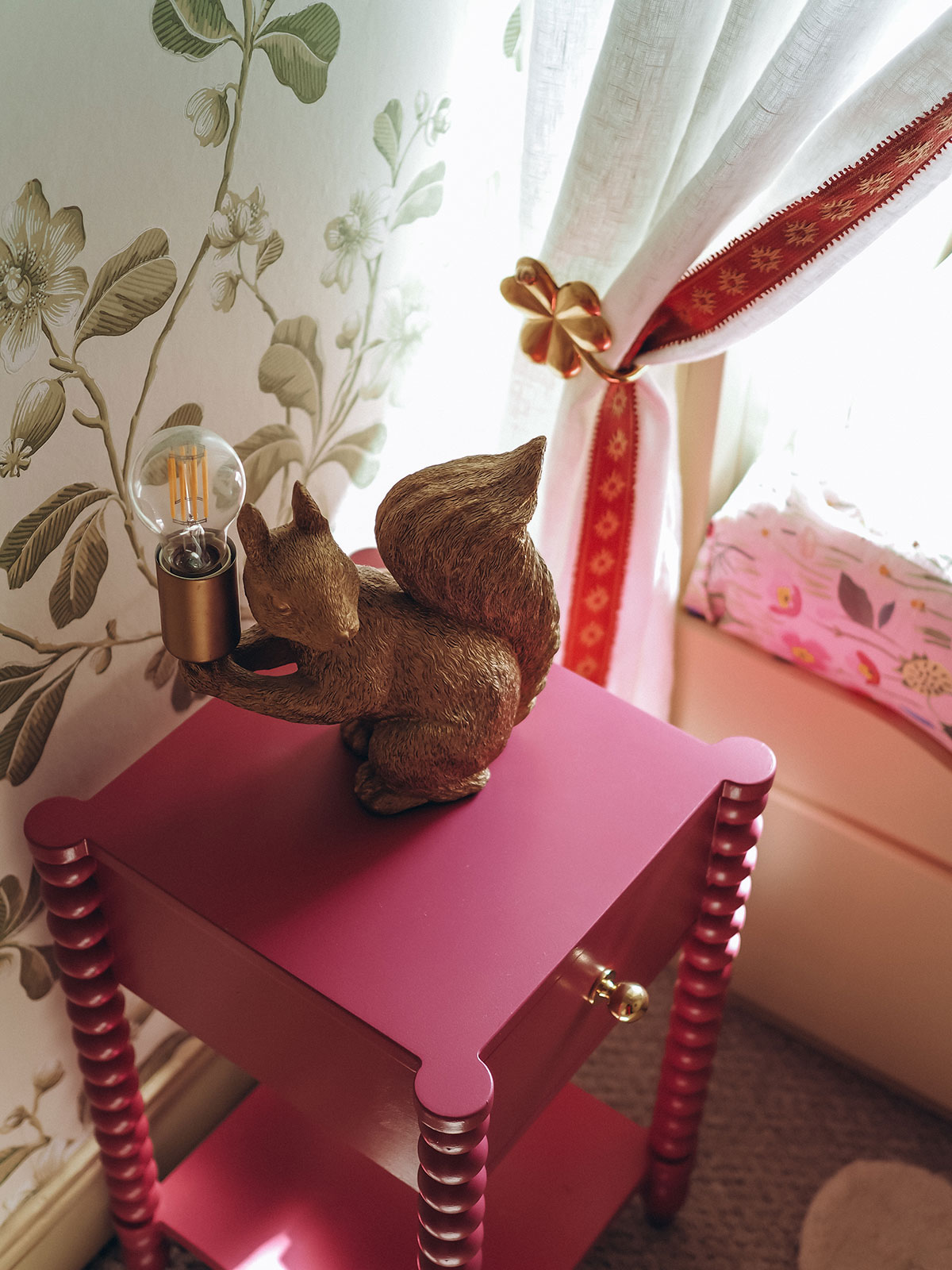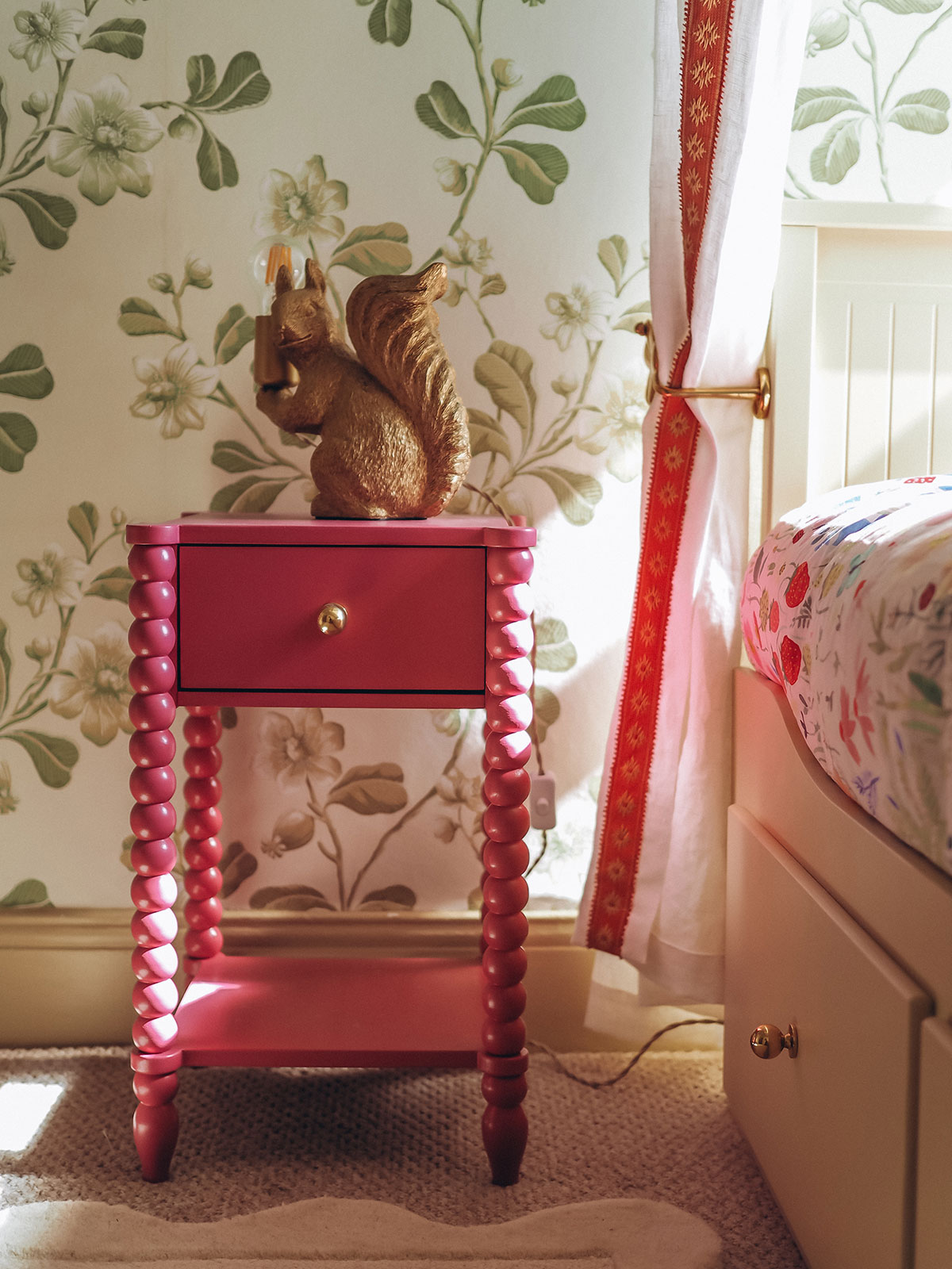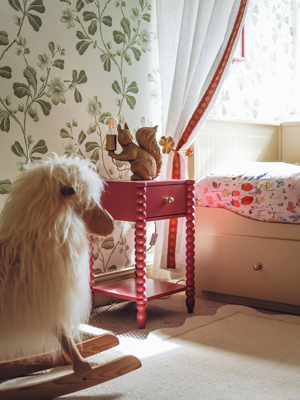 I knew I wanted to cover every surface in florals and just fell in love with Little Greene’s Broadwick Street wallpaper. Given the choice or blue or green, Summer chose ‘Garden’ and requested also her favourite pink to be included in the room. Mischief proved to be the perfect shade and I picked up a sweet little bobbin bedside table, gave it a good sand, three thin coats of pink and a new brass knob to tie it in with the bed hardware.