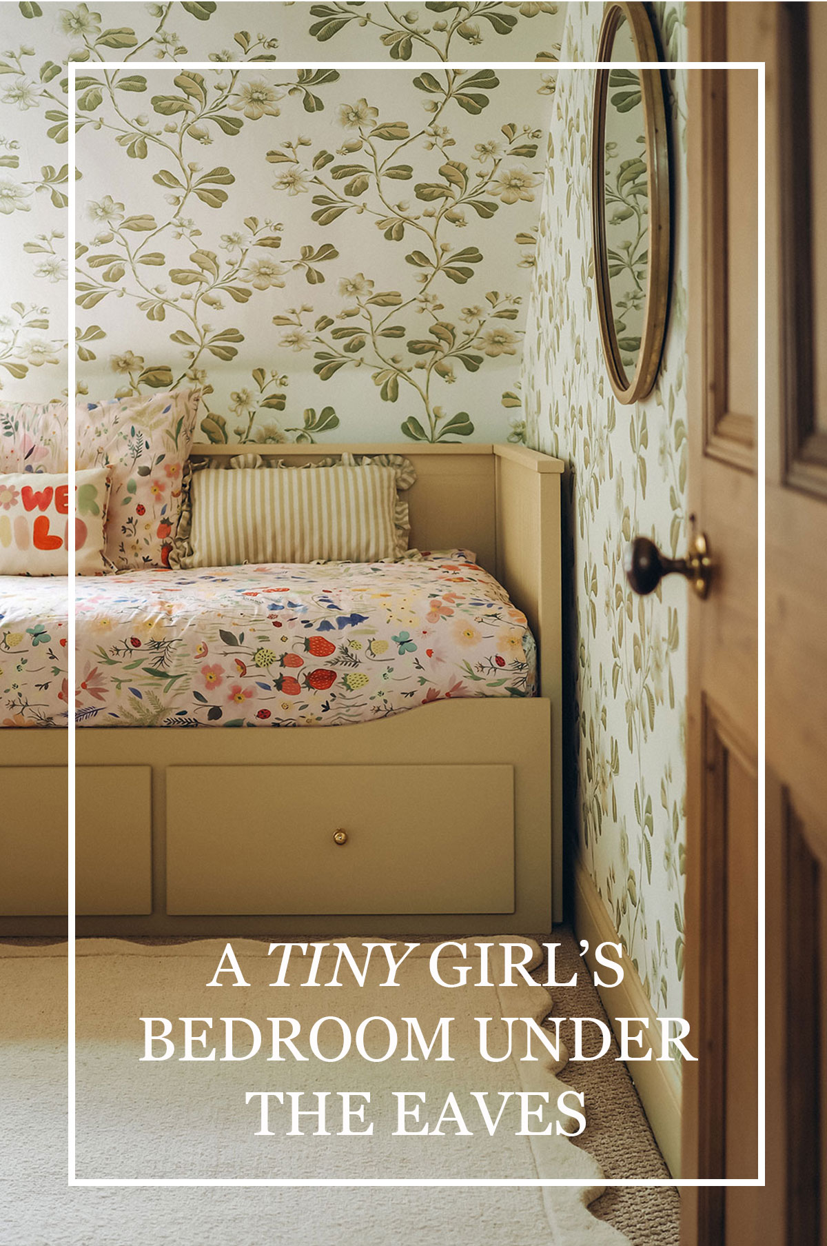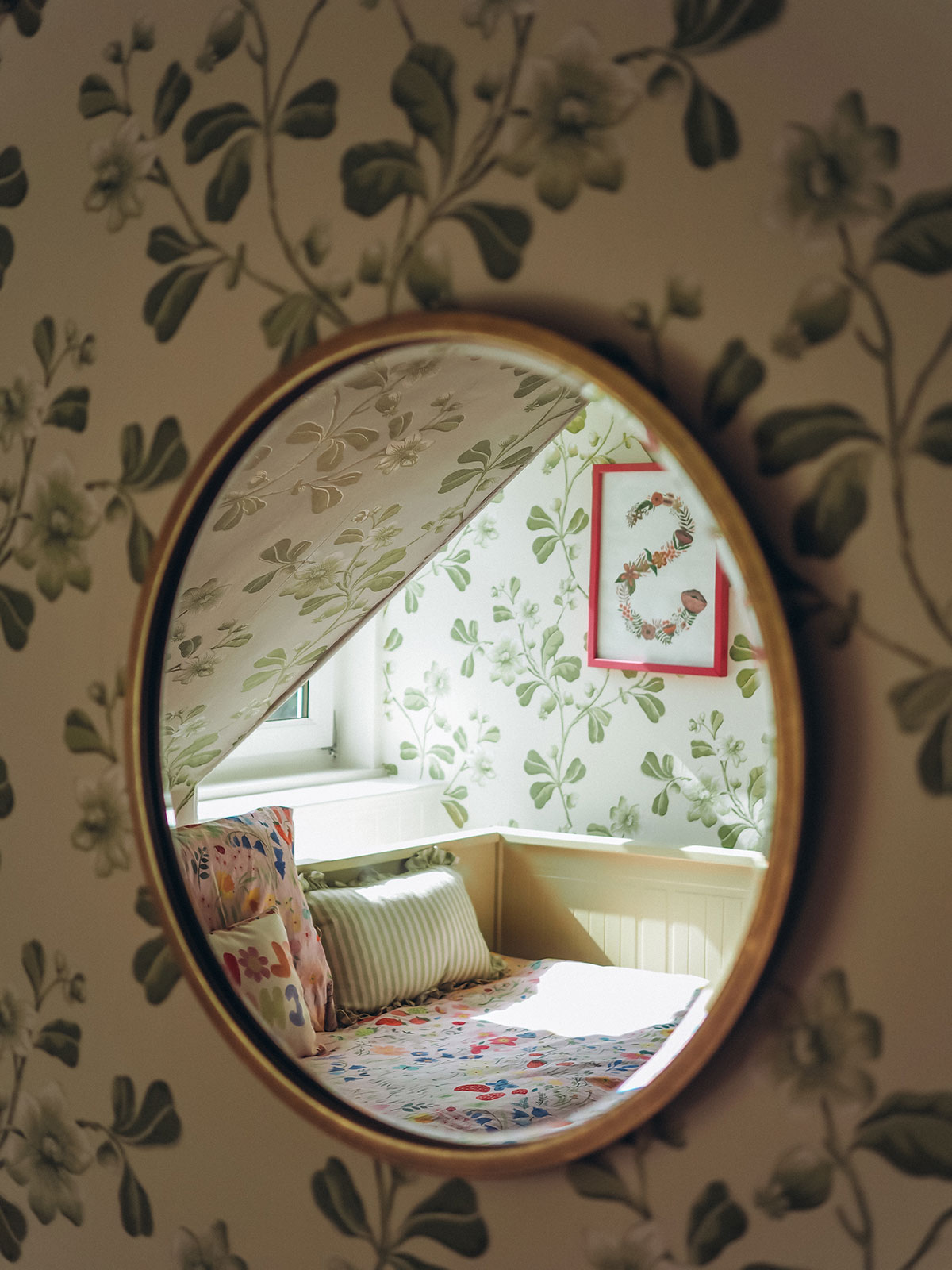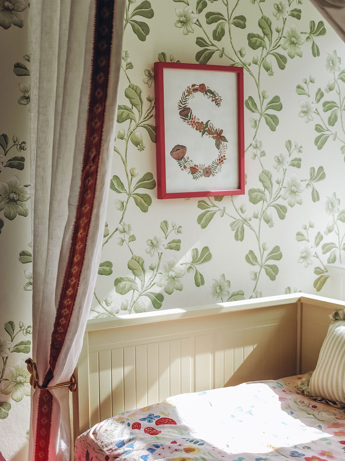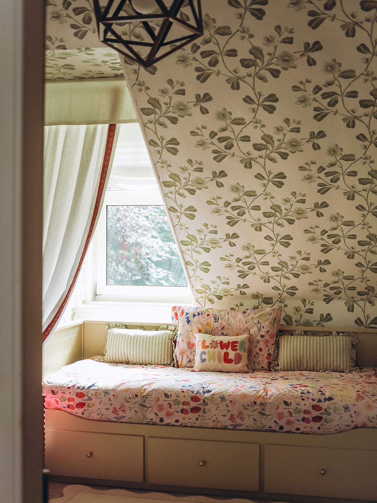 I knew I wanted to cover every surface in florals and just fell in love with Little Greene’s Broadwick Street wallpaper. Given the choice or blue or green, Summer chose ‘Garden’ and requested also her favourite pink to be included in the room. Mischief proved to be the perfect shade and I picked up a sweet little bobbin bedside table, gave it a good sand, three thin coats of pink and a new brass knob to tie it in with the bed hardware.